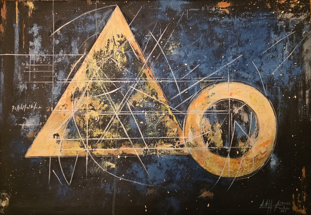 Cette œuvre magistrale d'Abderrahim Affif interprète l'un des piliers de la géométrie classique : le Théorème de Thalès. Sur un fond texturé évoquant l'immensité de l'univers, l'artiste superpose la rigueur des lignes mathématiques à une esthétique brute et organique. Le contraste entre le triangle d'or et les profondeurs bleues symbolise la clarté de l'esprit humain face au chaos du cosmos. Une pièce centrale de la collection Fuchs'Art qui réconcilie science exacte et émotion picturale.