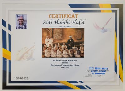 Cette œuvre monumentale de HAFID Sidi Hbibi est une plongée immersive dans la tradition. Elle représente une scène d'école coranique traditionnelle où un maître (le Taleb), à la posture digne et sereine, supervise un groupe de jeunes étudiants. Le sens du détail est remarquable : chaque visage possède une expression propre, et l'on distingue nettement les tablettes de bois (louhas) tenues par les élèves. La composition en cercle crée une sensation d'unité et de concentration. La lumière, chaude et latérale, souligne les textures des tissus et l'atmosphère studieuse de la pièce. C'est une œuvre d'une grande valeur ethnographique et artistique, capturant un moment clé de la vie sociale et spirituelle.