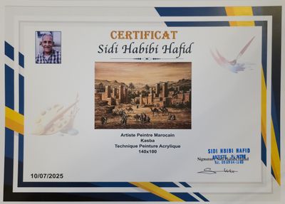 Cette œuvre monumentale offre une vue panoramique exceptionnelle sur une cité fortifiée traditionnelle. Sidi Habibi Hafid démontre ici toute l'étendue de son talent de paysagiste et de miniaturiste. La composition est d'une richesse rare : au premier plan, des scènes de vie quotidienne avec des dromadaires, des ânes et des groupes de villageois en pleine discussion, tandis que l'arrière-plan est dominé par les majestueuses tours de terre des Kasbahs. La précision des détails architecturaux et la douceur du ciel au couchant créent une atmosphère de sérénité et d'intemporalité. C'est une pièce de collection qui célèbre la splendeur des paysages présahariens.